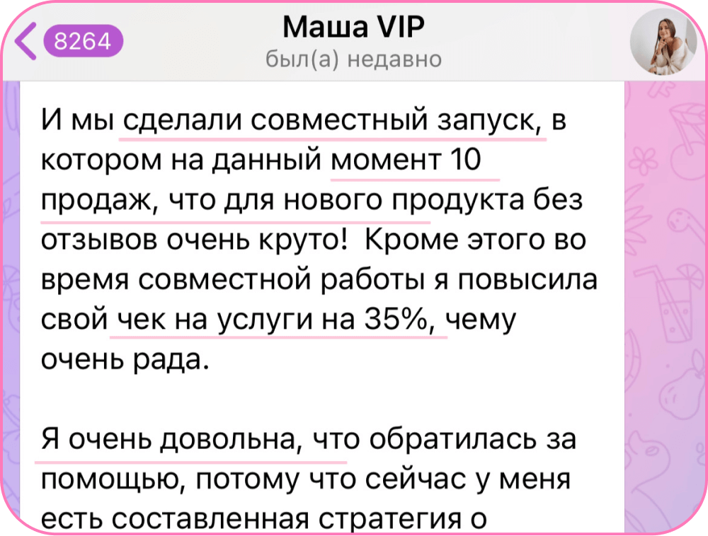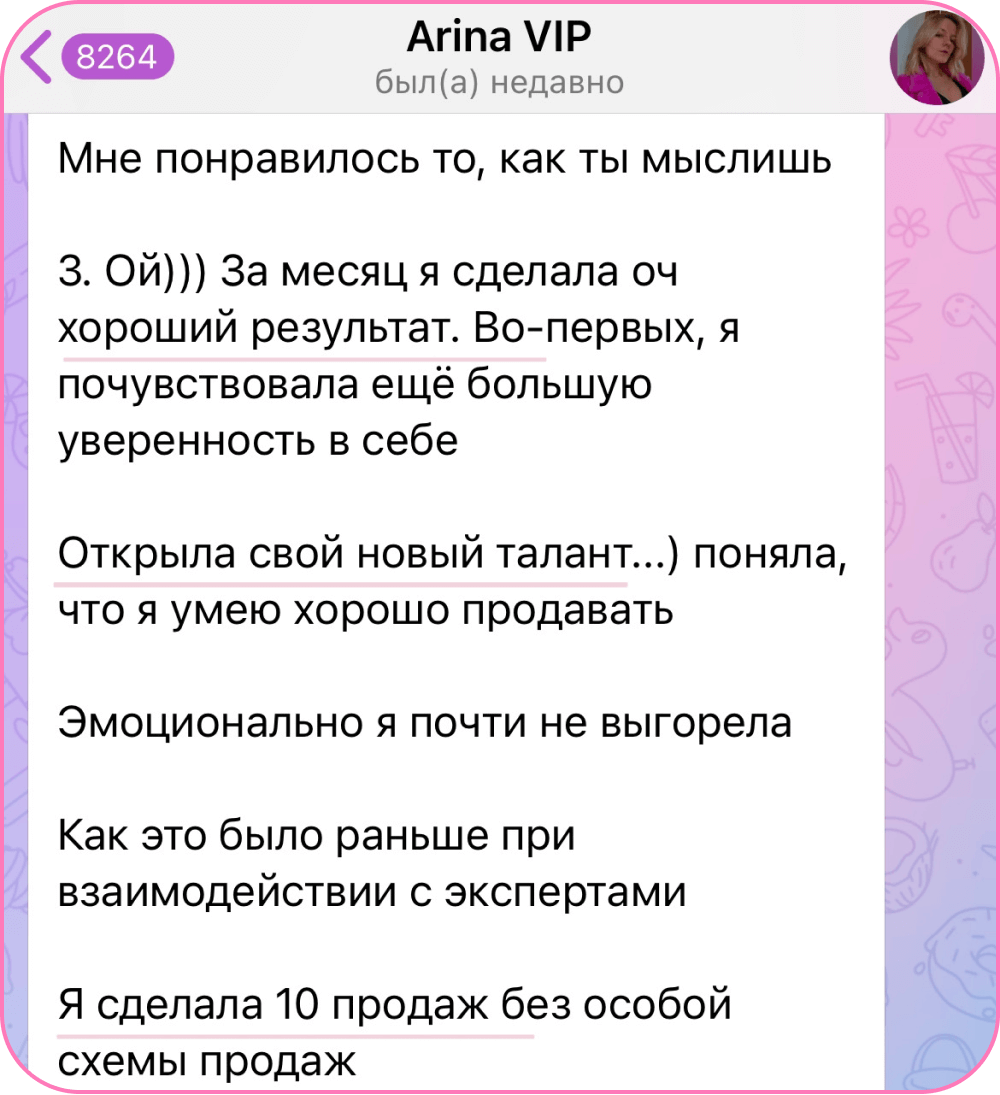 Провела 500+ индивидуальных консультаций за последний год для экспертов из разных ниш, в рамках которых составляла стратегии по упаковке и заработку с уникальными точками для роста